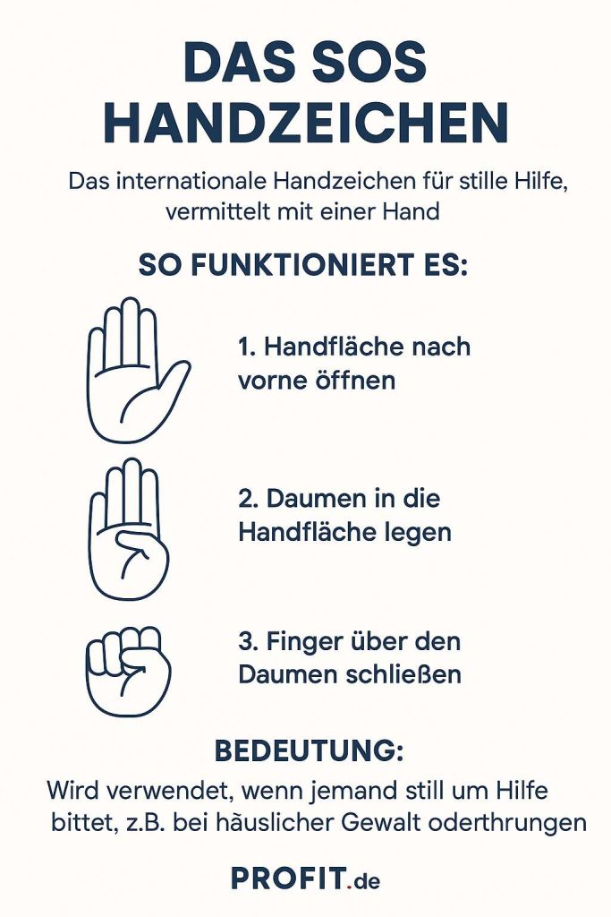 Das SOS Handzeichen ist ein stiller, aber wirkungsvoller Ruf nach Hilfe. Es ist leicht zu verstehen, sofort einsatzbereit und international anerkannt. Profit.de empfiehlt, dieses Wissen aktiv zu teilen und in Teams, Familien und Organisationen bekannt zu machen. Jede Person, die dieses Zeichen versteht, erhöht die Chance, dass Betroffene in kritischen Momenten Unterstützung erhalten.